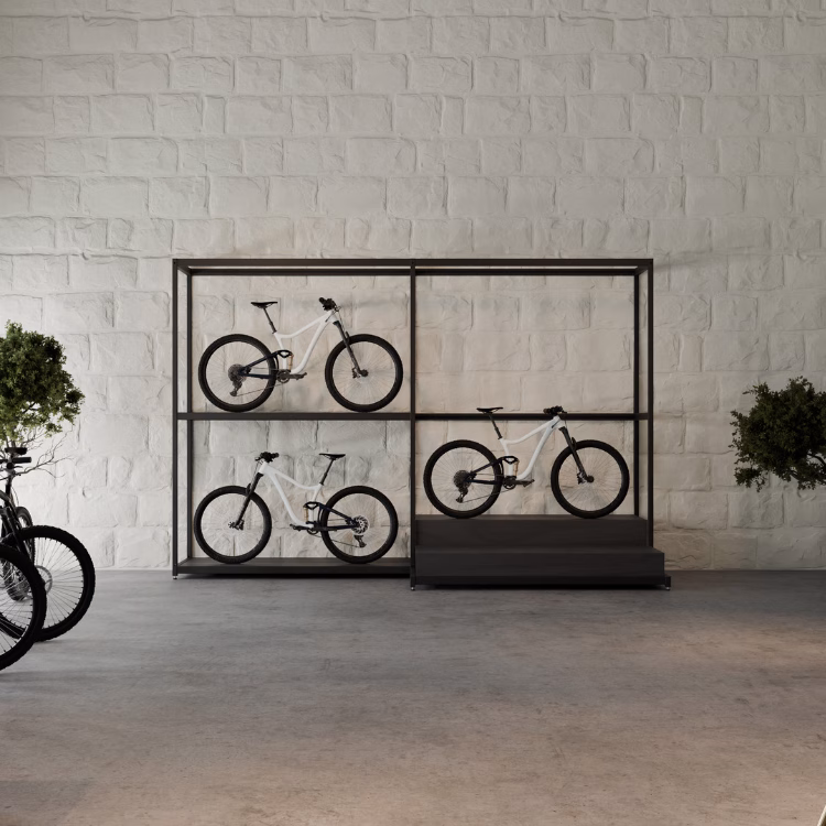 Stelvio is a 2M-wide base frame with a height of 2700 mm, designed for the presentation of bicycles in a vertical and space-efficient layout. The frame allows one or two bicycles to be displayed, creating a strong visual impact while maximising showroom capacity.